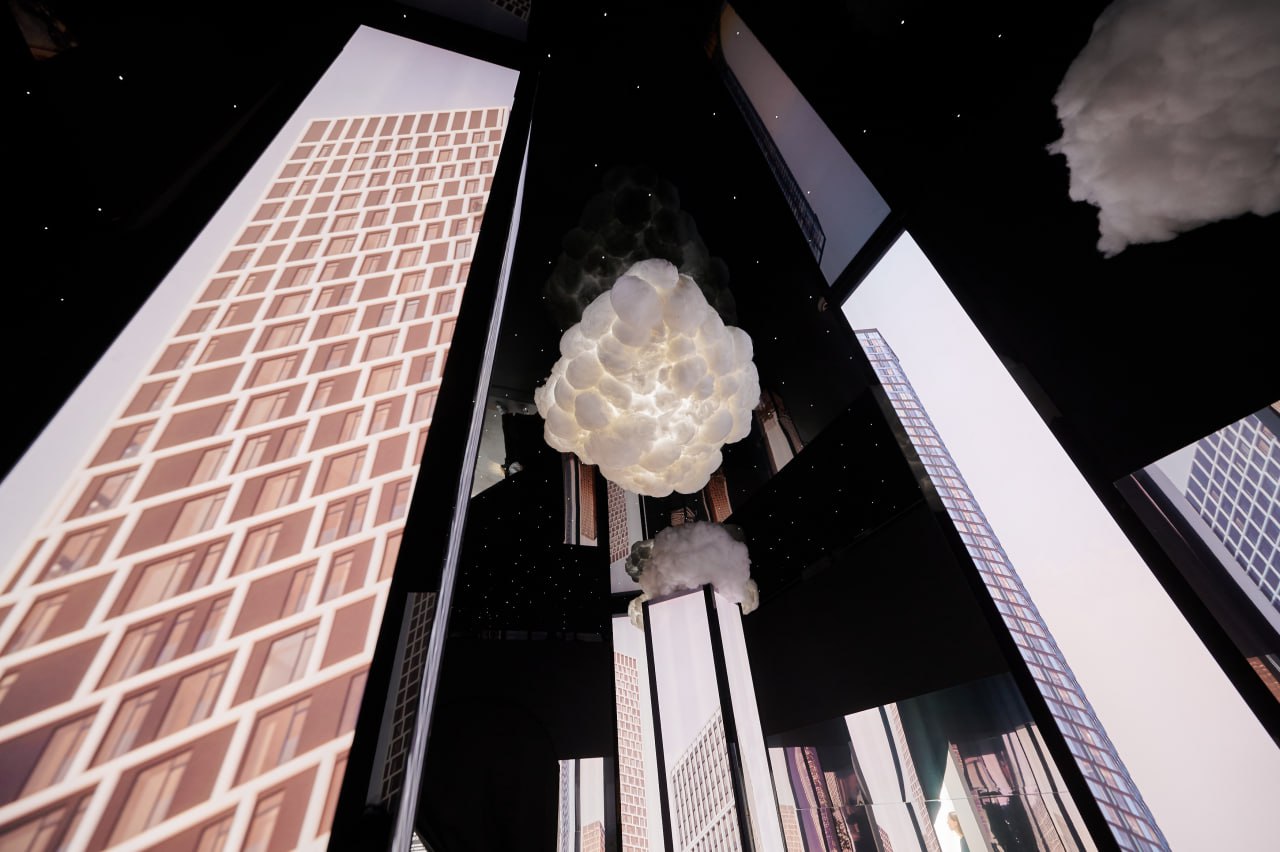 Павильон Генпро был посвящен теме “Вертикальная цивилизация”. Внутри павильона располагались величественные конструкции, олицетворяющие небоскребы, которые представляли собой не просто здания, а настоящие вертикальные города. Каждый из этих возвышающихся объёмов был окружен облаками и демонстрировал фасады высотных зданий, символизируя авторскую архитектуру компании Генпро.